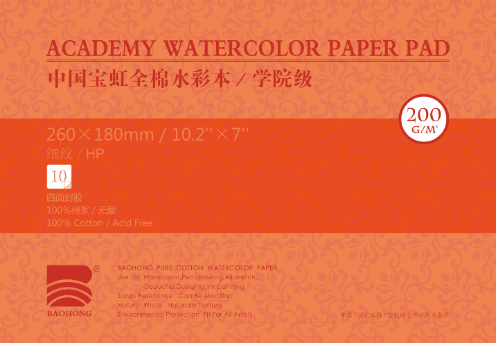 О серии: альбом склейка по 4-м сторонам. Внутри альбома блок из 10 листов мелкозернистой бумаги, выполненной из 100% хлопка. Бумага произведена без кислот и отбеливателей, обладает естественным белым цветом и плотностью 200 гр/м. Альбомы представлены в 3 различных форматах. Запатентованные методы обработки бумаги Baohong обеспечивают высокую насыщенность цвета даже после высыхания красок. Применение: для художественных работ акварелью и другими красками на водной основе. О бренде: изготавливается под брендом Baohong на фабрике по производству специализированной и художественной бумаги в Китае. Фабрика была основана в 1992 году и в настоящее время имеет множество запатентованных разработок бумаги различного типа — от эскизной до цифровой художественной бумаги для печати. Профессиональное качество, строгие технологии и широкая адаптивность обеспечивают высокие стандарты специализированной бумаги бренда Baohong для самых различных работ.