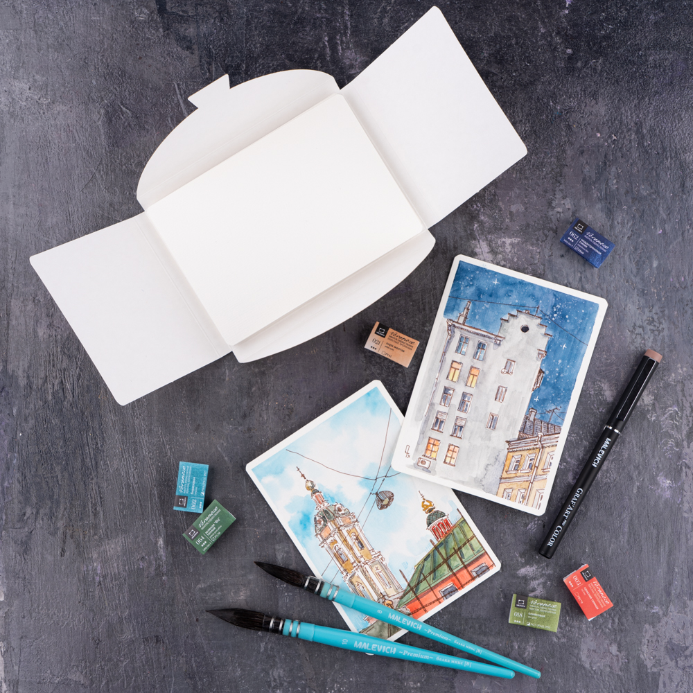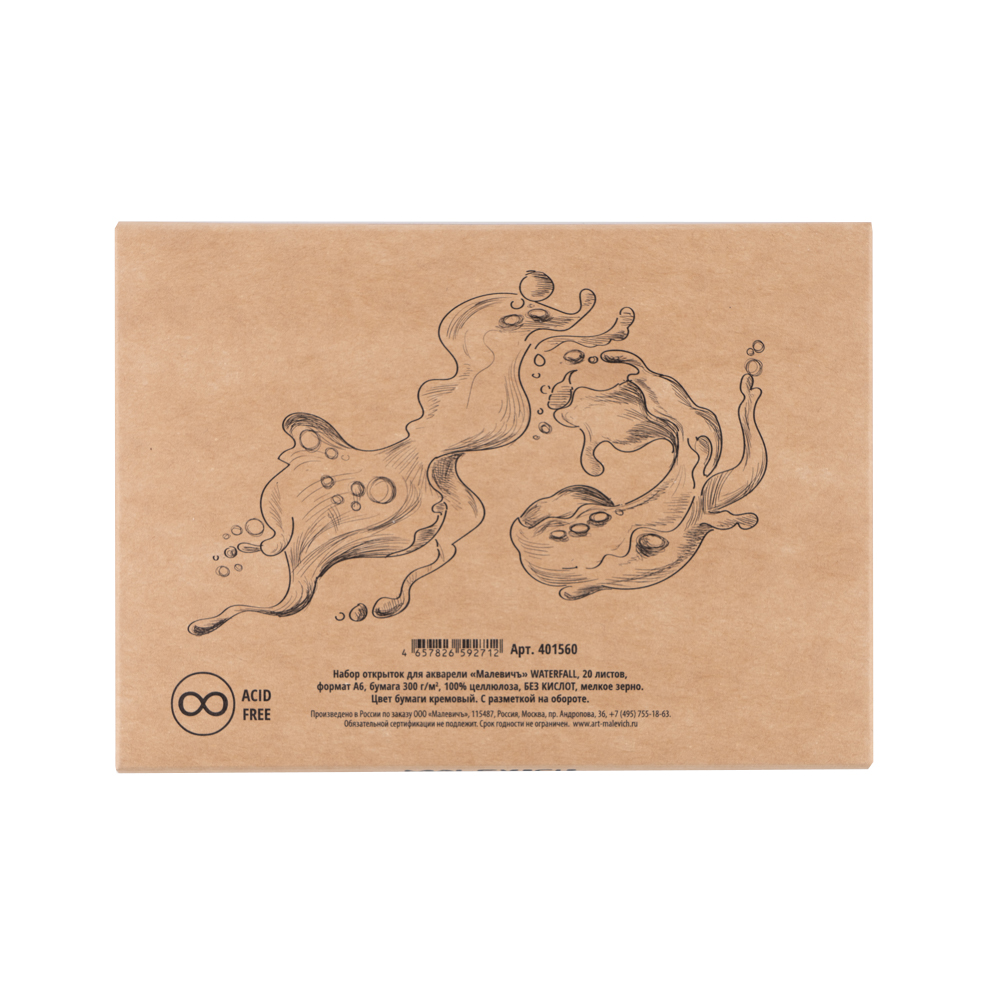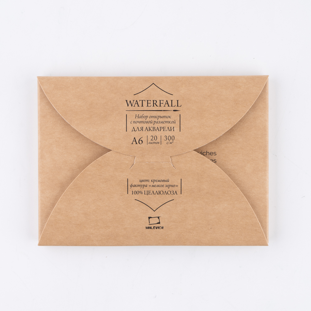 Новый формат бумаги – открытки А6 для любителей миниатюр и посткроссинга. Набор из 20 открыток с разметкой на обороте упакован в крафтовую коробку. Бумага Waterfall от «Малевичъ» из 100% целлюлозы может похвастаться приятным тактильным ощущением и мелкозернистой текстурой. Поверхность позволит проработать детали с исключительной четкостью и точностью. Цвета сильно не проседают и не прожухают после высыхания, как это обычно бывает на хлопковой бумаге. Стойкость бумаги Waterfall к истиранию позволит работать кистью ластиком и обычным ластиком, а плотность 300 г дает возможность работать в любой технике с использованием большого количества воды. Одной из особенностей этой бумаги является ее бескислотность, которая гарантирует, что иллюстрации выдержат испытание временем. Независимо от того, что изображено - скетчи, произведение искусства или открытки, можно быть уверенным, что эта бумага сохранит работу на долгие годы.