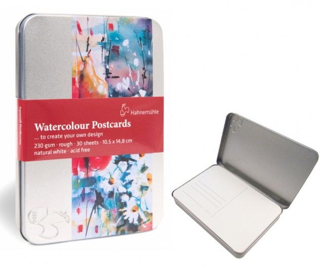 В компактной и удобной жестяной коробочке 30 заготовок для открыток из акварельной бумаги с закруглёнными краями. Текстура бумаги крупнозернистая с имитацией льняного плетения, на обратной стороне есть место для подписи и наклейки марок. Бумага из 100% целлюлозы, плотностью 230 г/м2, размер открытки 10,5х14,8 см. Объёма коробочки хватает, чтобы положить внутрь ещё краски, кисти или ручки для создания открытки в любом месте. Компактный набор, который легко взять с собой в путешествие и делиться впечатлениями со всем миром.
