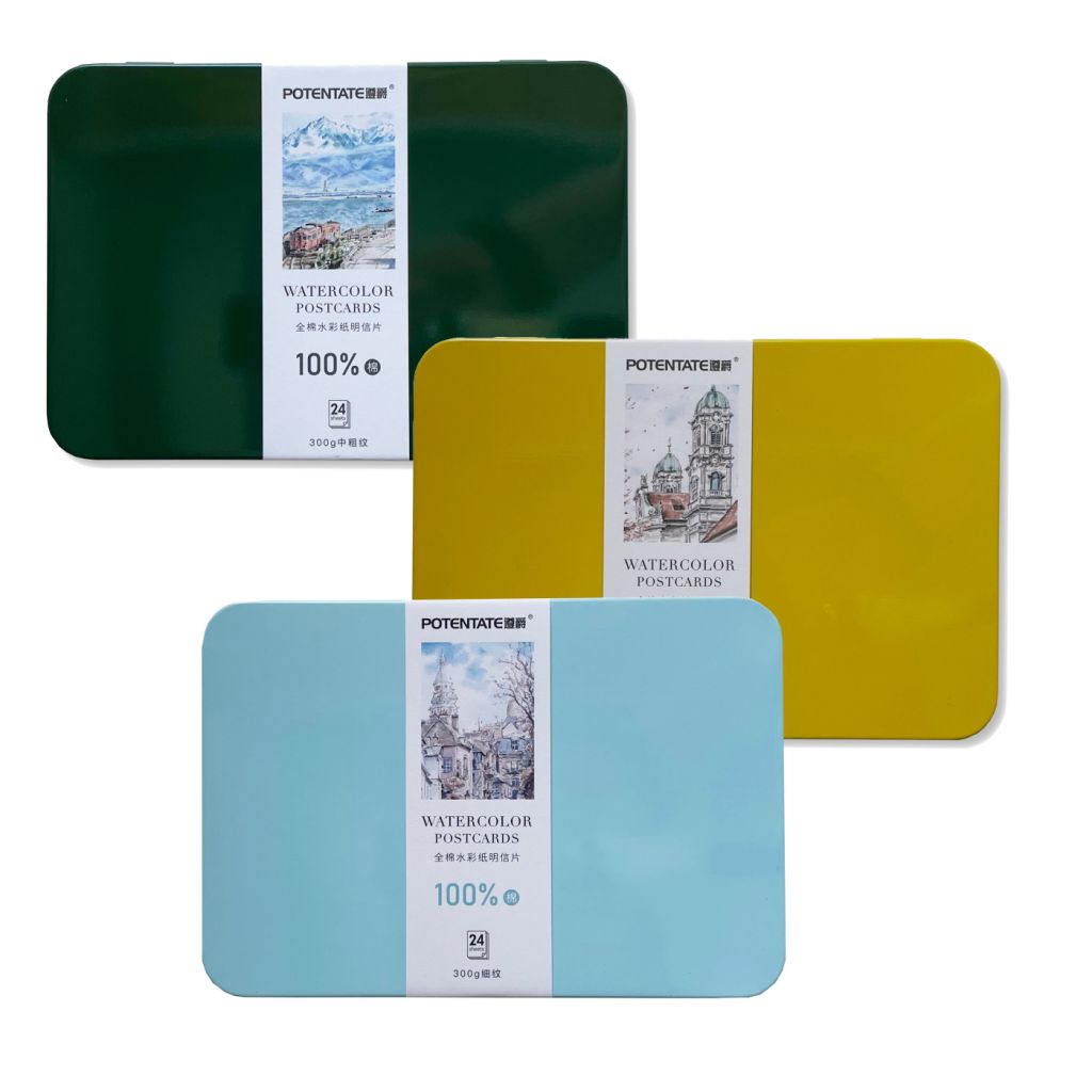 Наборы акварельных открыток от Potentate содержат по 24 листа бумаги выполненной из 100% хлопка без кислот отбеливателей. Плотность бумаги 300 гр/м2 позволяет создавать акварельные миниатюры с использованием большого количества воды. Фактура бумаги среднезернистая, на обратной стороне предусмотрена разметка для подписи. Размер открыток 10,5х15,5 см. Упакованы в металлические коробочки разных цветов.
