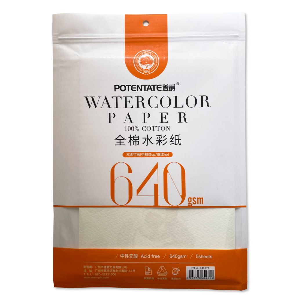 В наборе 5 листов бумаги с ярко выраженной фактурой, выполненной из 100% хлопка. Акварельная бумага плотностью 640 гр/м2 подойдет для работы с любыми водорастворимыми красками с использованием большого количества воды, устойчива к многочисленным смывкам и правкам Серия представлена бумагой в упаковке разного масштаба.