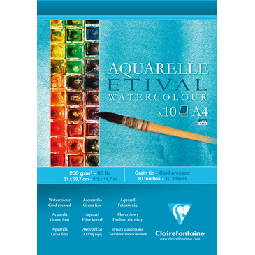 Бумага для акварели «Etival» («Этиваль») выпускается французской компанией «CLAIREFONTAINE» («Клэрфонтэн»). Компания прошла путь от маленького семейного производства до одного из крупнейших изготовителей бумажной продукции. Сегодня «CLAIREFONTAINE» выпускает более 150 видов бумаги, которая пользуется популярностью у студентов, дизайнеров и профессиональных художников. Бумага для акварели «Etival»изготавливается из 100% целлюлозы, но сохраняет такие же качества, как бумага из хлопка. Производится без добавления кислот. Поверхность бумаги хорошо взаимодействует с акварелью и гуашью, позволяя работать в различных техниках. Бумага для акварели «Etival» выпускается плотностью 200 и 300 г/кв.м. Предлагается с различной фактурой: среднее зерно (fin) и крупное зерно (torchon). Производится поштучно в листах и в альбомах различных форматов.