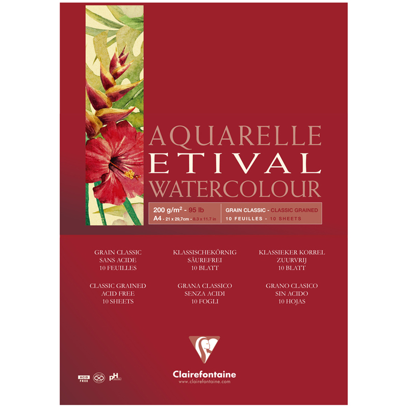 Бумага для акварели «Etival»изготавливается из 100% целлюлозы, но сохраняет такие же качества, как бумага из хлопка. Производится без добавления кислот. Поверхность бумаги хорошо взаимодействует с акварелью и гуашью, позволяя работать в различных техниках. Бумага для акварели «Etival» выпускается плотностью 200 и 300 г/кв.м. Предлагается с различной фактурой. Производится поштучно в листах и в альбомах различных форматов. Бумага для акварели «Etival» («Этиваль») выпускается французской компанией «CLAIREFONTAINE» («Клэрфонтэн»). Компания прошла путь от маленького семейного производства до одного из крупнейших изготовителей бумажной продукции. Сегодня «CLAIREFONTAINE» выпускает более 150 видов бумаги, которая пользуется популярностью у студентов, дизайнеров и профессиональных художников.