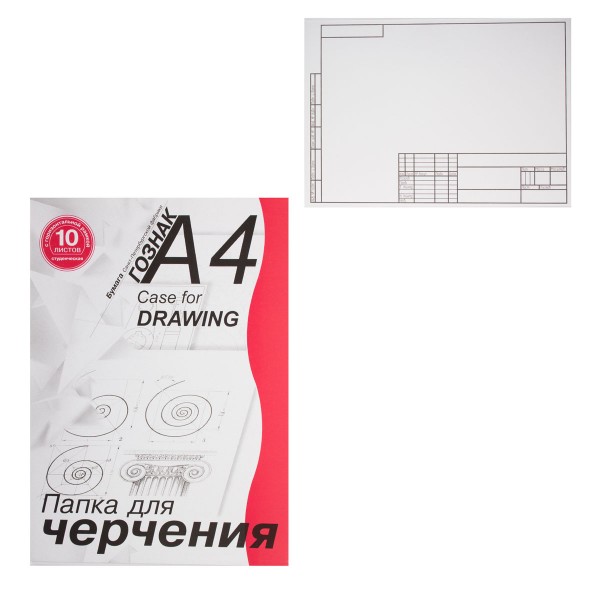 Папки для черчения студенческие, формат А-4, с горизонтальной и вертикальной рамкой. Содержат 10 листов. Бумага чертёжная марки А (ватман) производства СПБФ Гознака, плотностью 180 г/м?.
