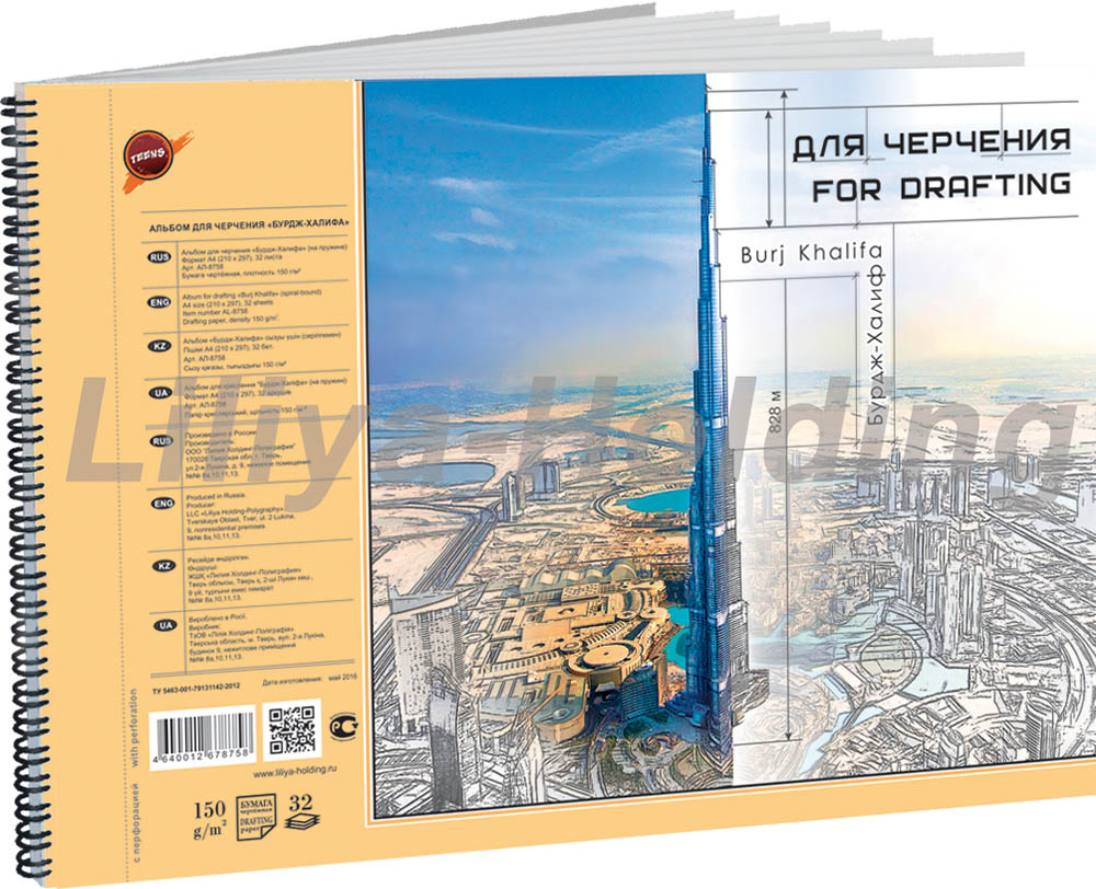 О серии: чертёжно-техническая бумага для альбомов «Бурдж Халифа» изготавливается из тщательно подобранного сырья. Альбомы представлены в формате А4 и А3. В каждом альбоме по 32 листа. Брошюрованы спиралью по короткой стороне. Все листы имеют микроперфорацию вдоль спирали. Характеристики: бумага обладает естественным белым цветом. Плотность 150 г/кв.м. Бумага сохраняет свои поверхностные свойства даже больше многочисленных подчисток и исправлений. Применение: альбом подходит для чертёжных, технических и графических работ. Бумага подходит для выполнения работ тушью, карандашами, ручками, мелками и другими графическими материалами. Производство: производится российской компанией «Лилия Холдинг», основанной в 2000 году. Компания является официальным партнером Санкт-Петербургской бумажной фабрики – филиала государственного унитарного предприятия «Гознак». При производстве бумаги специалисты компании используют современные технологии, что позволяет изготавливать бумагу высшего сорта. За время существования компания стала одним из крупнейших производителей бумаги в России.