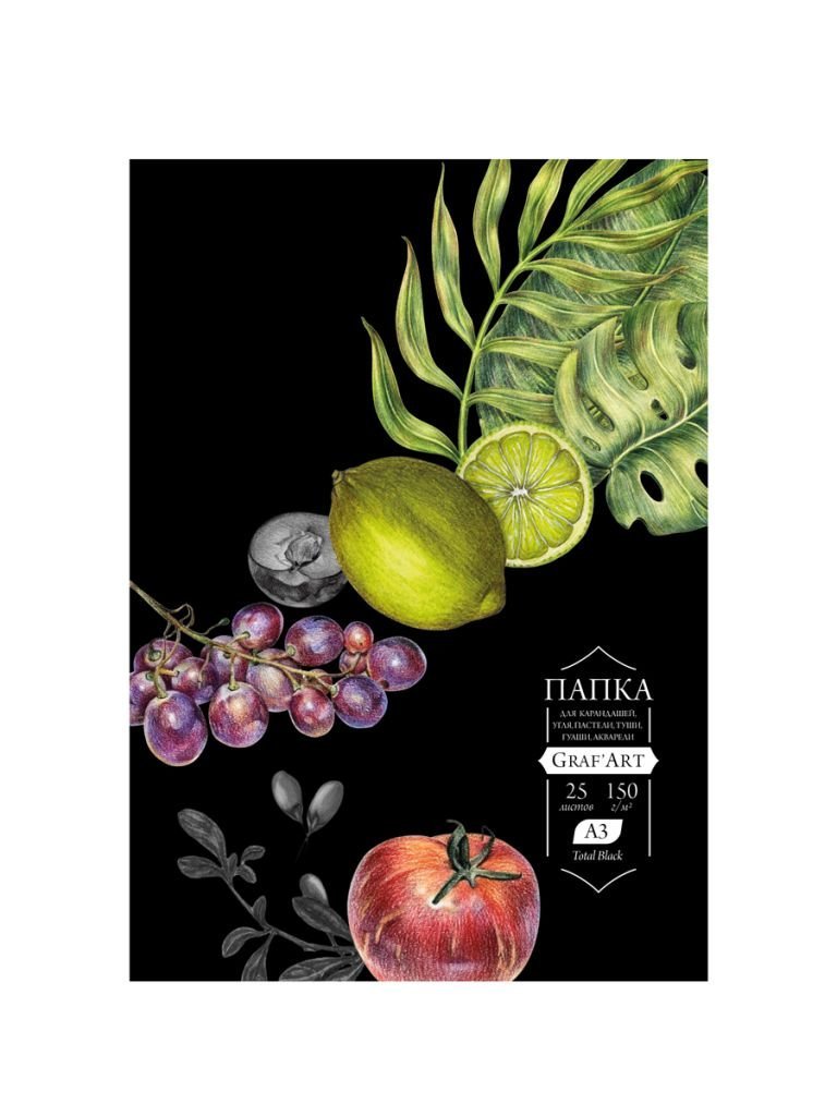 Внутри папки 25 листов высокачественной бумаги тонированной в черный цвет. Плотность бумаги 150 гр/м2 и слегка шероховатая поверхность делают её идеальной основой для рисования любыми графическими материалами — карандаши, пастель, гелевые ручки, линеры соус и сангина. На черной бумаге особенно эффектно смотрятся работы выполненные яркими цветами, цветами с металлическими или мерцающим эффектом, а так же белыми гелевыми ручками.