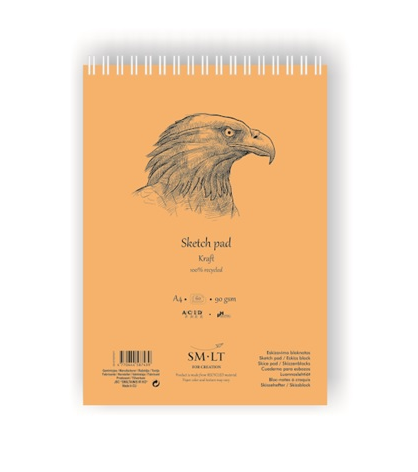 Блокнот состоит из натуральной крафт-бумаги коричневого цвета с микроперфорацией. Крепление на спирали позволяет раскрывать блокнот полностью. Верхняя обложка из переработанной бумаги, задник из плотного картона позволяет рисовать на весу, используя задник в качестве планшета. Блокнот предназначен для эскизов и набросков сухими художественными материалами.
