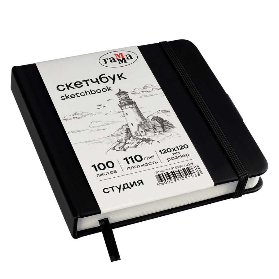 Скетчбук «ГАММА» размером 12х12 идеален для эскизов, набросков, скетчинга, записей. Подойдёт как для художников, дизайнеров, так и для студентов, школьников. Внутренний блок состоит из 100 листов высококачественной бумаги цвета слоновой кости плотностью 110 г/м2. Походит для рисования разными материалами: карандашами, линерами, пастелью, графитом, ручками и другими. Тип скрепления – сшивка. Лаконичный, компактный размер и жёсткая обложка с эффектом soft-touch обеспечивает удобство зарисовок на прогулке или в путешествии. Цвет обложки – чёрный. Закладка-ляссе помогает быстро открыть скетчбук на нужной странице, а эластичная резинка предотвращает листы от замятия и случайного открытия. Скетчбук удобно брать в путешествие, на прогулку или пленэр.
