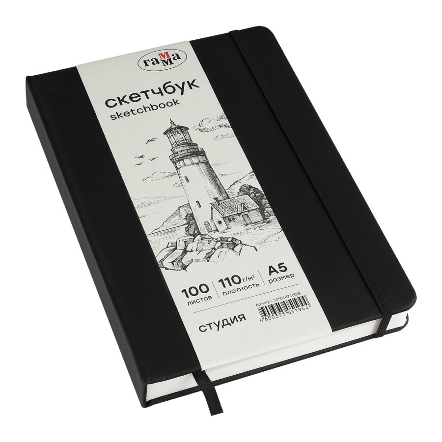 Скетчбук «ГАММА» формата A5 идеален для эскизов, набросков, скетчинга, записей. Подойдёт как для художников, дизайнеров, так и для студентов, школьников. Внутренний блок состоит из 100 листов высококачественной бумаги цвета слоновой кости плотностью 110 г/м2. Походит для рисования разными материалами: карандашами, линерами, пастелью, графитом, ручками и другими. Тип скрепления – сшивка. Лаконичный, компактный размер и жёсткая обложка с эффектом soft-touch обеспечивает удобство зарисовок на прогулке или в путешествии. Цвет обложки – чёрный. Закладка-ляссе помогает быстро открыть скетчбук на нужной странице, а эластичная резинка предотвращает листы от замятия и случайного открытия. Скетчбук удобно брать в путешествие, на прогулку или пленэр.
