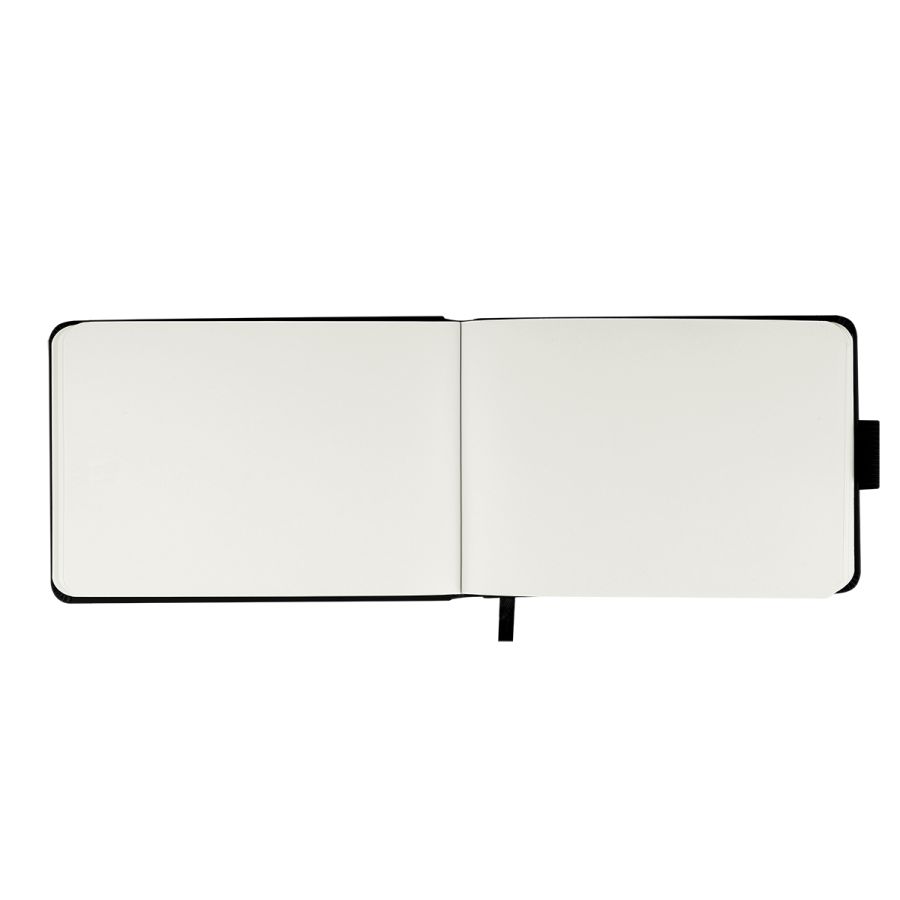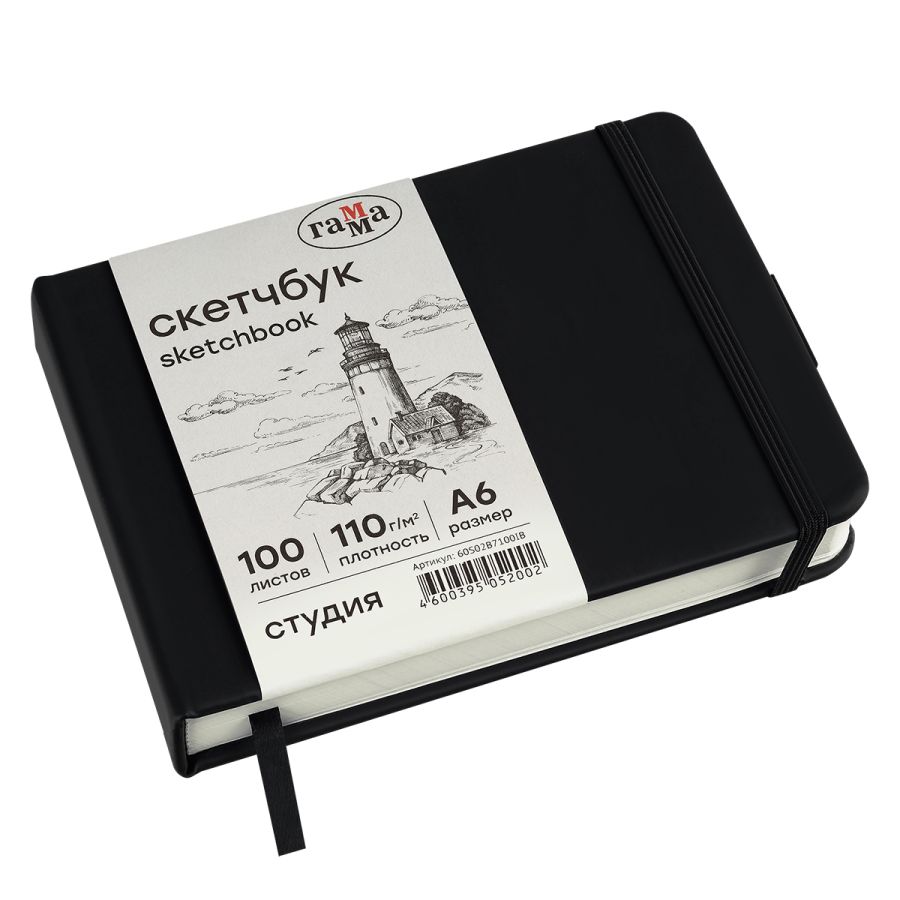 Скетчбук «ГАММА» размером 14,8х10,5 идеален для эскизов, набросков, скетчинга, записей. Подойдёт как для художников, дизайнеров, так и для студентов, школьников. Внутренний блок состоит из 100 листов высококачественной бумаги цвета слоновой кости плотностью 110 г/м2. Походит для рисования разными материалами: карандашами, линерами, пастелью, графитом, ручками и другими. Тип скрепления – сшивка. Лаконичный, компактный размер и жёсткая обложка с эффектом soft-touch обеспечивает удобство зарисовок на прогулке или в путешествии. Цвет обложки – чёрный. Закладка-ляссе помогает быстро открыть скетчбук на нужной странице, а эластичная резинка предотвращает листы от замятия и случайного открытия. Скетчбук удобно брать в путешествие, на прогулку или пленэр.