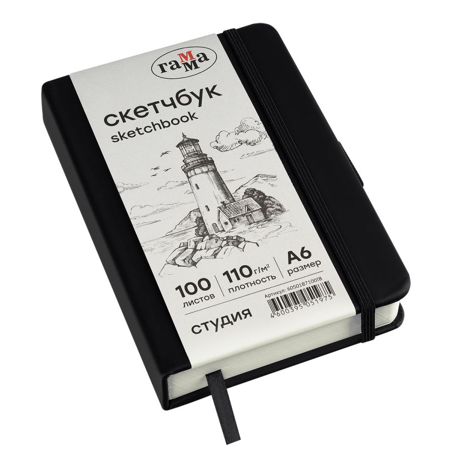 Скетчбук «ГАММА» формата A6 идеален для эскизов, набросков, скетчинга, записей. Подойдёт как для художников, дизайнеров, так и для студентов, школьников. Внутренний блок состоит из 100 листов высококачественной бумаги цвета слоновой кости плотностью 110 г/м2. Походит для рисования разными материалами: карандашами, линерами, пастелью, графитом, ручками и другими. Тип скрепления – сшивка. Лаконичный, компактный размер и жёсткая обложка с эффектом soft-touch обеспечивает удобство зарисовок на прогулке или в путешествии. Цвет обложки – чёрный. Закладка-ляссе помогает быстро открыть скетчбук на нужной странице, а эластичная резинка предотвращает листы от замятия и случайного открытия. Скетчбук удобно брать в путешествие, на прогулку или пленэр.