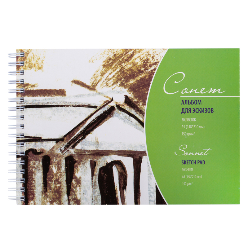 Альбом "Сонет" содержит 30 листов формата А4. Альбом изготовлен из серо-сиреневого цвета целлюлозной бумаги плотностью 150 г/м2. Предназначен для создания набросков и зарисовок мягкими графическими материалами: пастелью, соусом, сангиной, углем, ретушью, карандашом и смешанных техник.