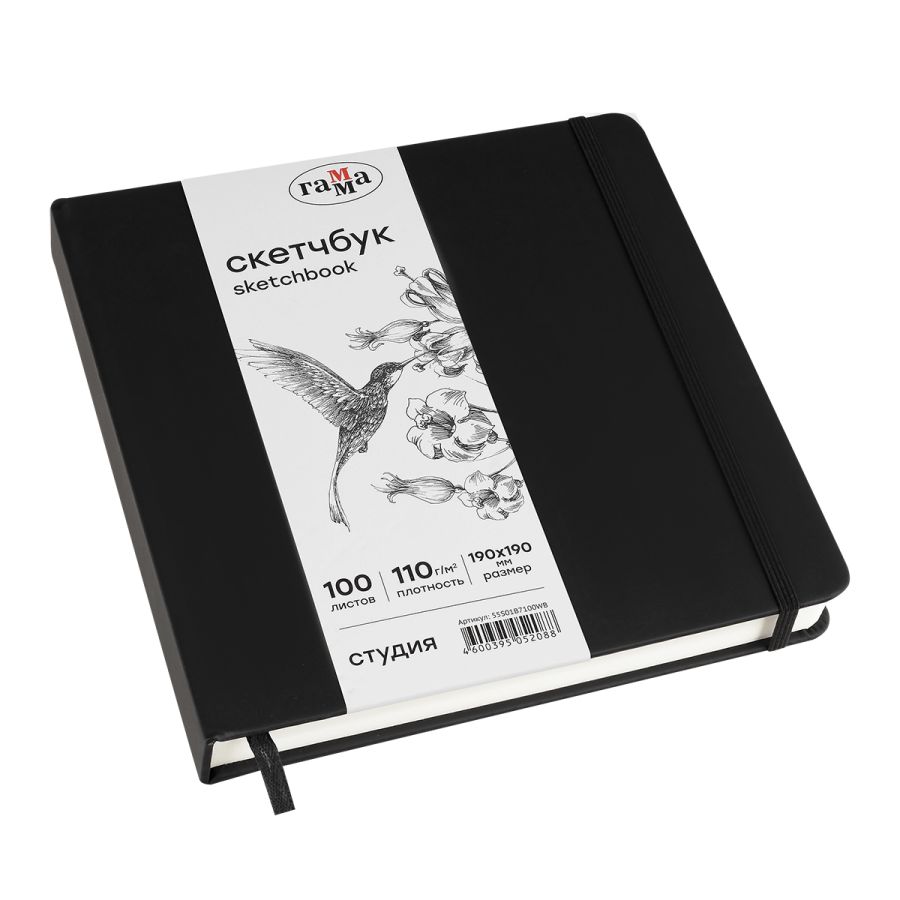 Скетчбук «ГАММА» размером 19х19 идеален для эскизов, набросков, скетчинга, записей. Подойдёт как для художников, дизайнеров, так и для студентов, школьников. Внутренний блок состоит из 100 листов высококачественной бумаги белого цвета плотностью 110 г/м2. Походит для рисования разными материалами: карандашами, линерами, пастелью, графитом, ручками и другими. Тип скрепления – сшивка. Лаконичный, компактный размер и жёсткая обложка с эффектом soft-touch обеспечивает удобство зарисовок на прогулке или в путешествии. Цвет обложки – чёрный. Закладка-ляссе помогает быстро открыть скетчбук на нужной странице, а эластичная резинка предотвращает листы от замятия и случайного открытия. Скетчбук удобно брать в путешествие, на прогулку или пленэр.
