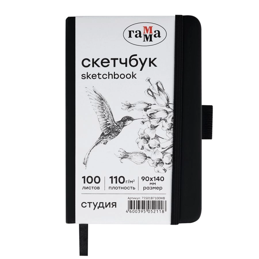 Скетчбук «ГАММА» идеален для эскизов, набросков, скетчинга, записей. Подойдёт как для художников, дизайнеров, так и для студентов, школьников. Внутренний блок состоит из 100 листов высококачественной бумаги белого цвета плотностью 110 г/м2. Походит для рисования разными материалами: карандашами, линерами, пастелью, графитом, ручками и другими. Тип скрепления – сшивка. Лаконичный, компактный размер и жёсткая обложка с эффектом soft-touch обеспечивает удобство зарисовок на прогулке или в путешествии. Цвет обложки – чёрный. Закладка-ляссе помогает быстро открыть скетчбук на нужной странице, а эластичная резинка предотвращает листы от замятия и случайного открытия. Скетчбук удобно брать в путешествие, на прогулку или пленэр. Размер: 9х14 см