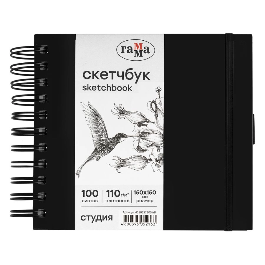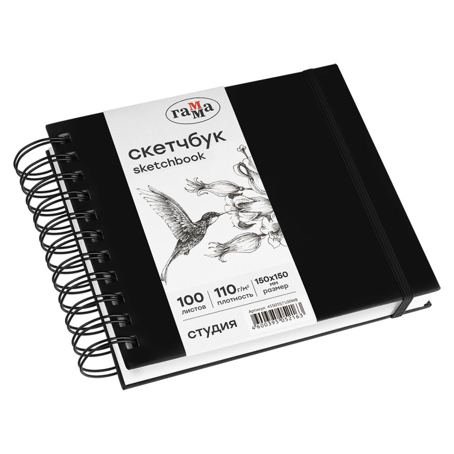 Скетчбук «ГАММА» размером 15х15 идеален для эскизов, набросков, скетчинга, записей. Подойдёт как для художников, дизайнеров, так и для студентов, школьников. Внутренний блок состоит из 100 листов высококачественной бумаги белого цвета плотностью 110 г/м2. Походит для рисования разными материалами: карандашами, линерами, пастелью, графитом, ручками и другими. Тип скрепления – спираль. Лаконичный, компактный размер и жёсткая обложка с эффектом soft-touch обеспечивает удобство зарисовок на прогулке или в путешествии. Цвет обложки – черный. Эластичная резинка предотвращает листы от замятия и случайного открытия. Скетчбук удобно брать в путешествие, на прогулку или пленэр.