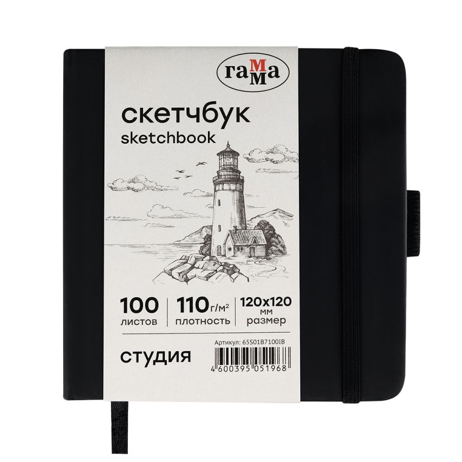 Скетчбук «ГАММА» размером 12х12 идеален для эскизов, набросков, скетчинга, записей. Подойдёт как для художников, дизайнеров, так и для студентов, школьников. Внутренний блок состоит из 100 листов высококачественной бумаги цвета слоновой кости плотностью 110 г/м2. Походит для рисования разными материалами: карандашами, линерами, пастелью, графитом, ручками и другими. Тип скрепления – сшивка. Лаконичный, компактный размер и жёсткая обложка с эффектом soft-touch обеспечивает удобство зарисовок на прогулке или в путешествии. Цвет обложки – чёрный. Закладка-ляссе помогает быстро открыть скетчбук на нужной странице, а эластичная резинка предотвращает листы от замятия и случайного открытия. Скетчбук удобно брать в путешествие, на прогулку или пленэр.