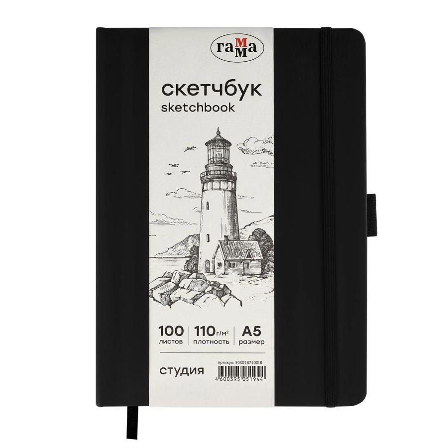Скетчбук «ГАММА» формата A5 идеален для эскизов, набросков, скетчинга, записей. Подойдёт как для художников, дизайнеров, так и для студентов, школьников. Внутренний блок состоит из 100 листов высококачественной бумаги цвета слоновой кости плотностью 110 г/м2. Походит для рисования разными материалами: карандашами, линерами, пастелью, графитом, ручками и другими. Тип скрепления – сшивка. Лаконичный, компактный размер и жёсткая обложка с эффектом soft-touch обеспечивает удобство зарисовок на прогулке или в путешествии. Цвет обложки – чёрный. Закладка-ляссе помогает быстро открыть скетчбук на нужной странице, а эластичная резинка предотвращает листы от замятия и случайного открытия. Скетчбук удобно брать в путешествие, на прогулку или пленэр.