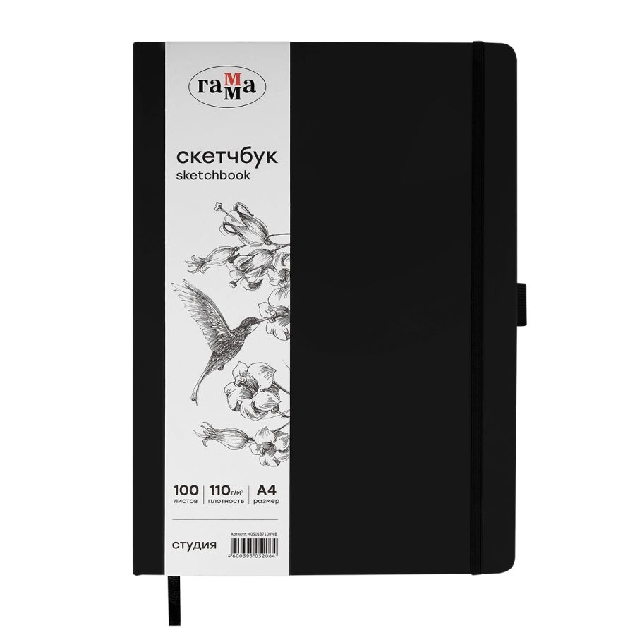 Скетчбук «ГАММА» формата А4 идеален для эскизов, набросков, скетчинга, записей. Подойдёт как для художников, дизайнеров, так и для студентов, школьников. Внутренний блок состоит из 100 листов высококачественной бумаги белого цвета плотностью 110 г/м2. Походит для рисования разными материалами: карандашами, линерами, пастелью, графитом, ручками и другими. Тип скрепления – сшивка. Цвет обложки – чёрный. Закладка-ляссе помогает быстро открыть скетчбук на нужной странице, а эластичная резинка предотвращает листы от замятия и случайного открытия.