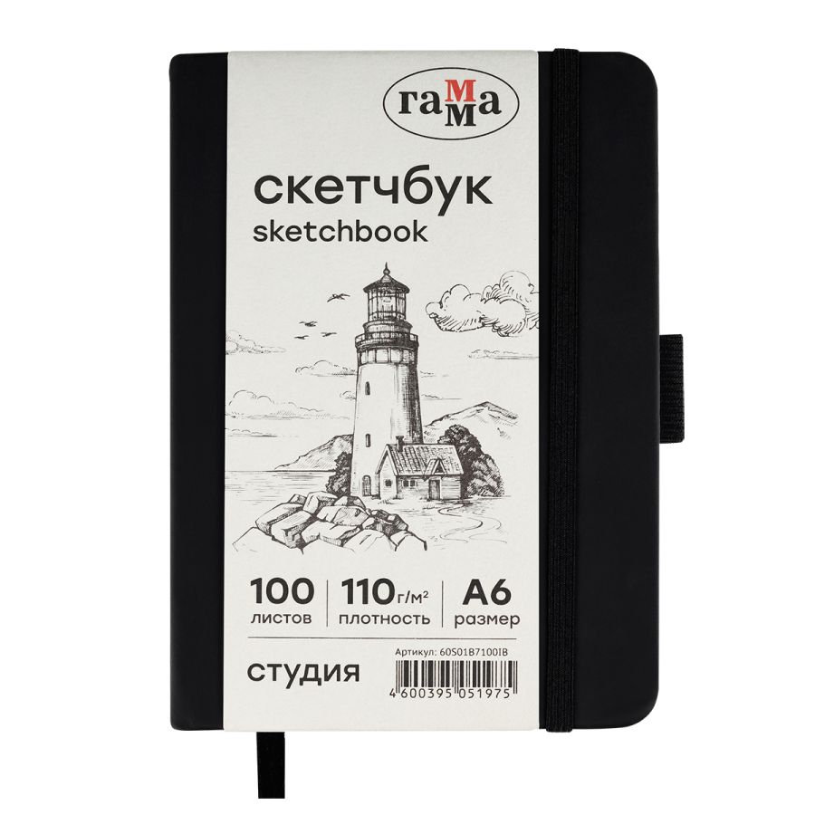 Скетчбук «ГАММА» формата A6 идеален для эскизов, набросков, скетчинга, записей. Подойдёт как для художников, дизайнеров, так и для студентов, школьников. Внутренний блок состоит из 100 листов высококачественной бумаги цвета слоновой кости плотностью 110 г/м2. Походит для рисования разными материалами: карандашами, линерами, пастелью, графитом, ручками и другими. Тип скрепления – сшивка. Лаконичный, компактный размер и жёсткая обложка с эффектом soft-touch обеспечивает удобство зарисовок на прогулке или в путешествии. Цвет обложки – чёрный. Закладка-ляссе помогает быстро открыть скетчбук на нужной странице, а эластичная резинка предотвращает листы от замятия и случайного открытия. Скетчбук удобно брать в путешествие, на прогулку или пленэр.
