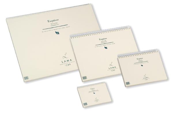 О серии: альбомы «Esquisse» специально разработаны для эскизов. Альбомы выпускаются в трёх форматах: А5, А4 и А3. Альбомы имеют по 60 листов, брошюрованы металлической спиралью по длинной стороне. Для удобства отрыва листов имеется микроперфорация вдоль спирали. Характеристика: белая матовая бумага имеет мелкозернистую фактуру. Плотность бумаги 96 г/кв.м. Применение: подходит для выполнения эскизов и каллиграфических работ. В таком альбоме можно работать чернографитовыми и цветными карандашами, тушью, пастелью, углём и сангиной. Производство: производит компания «LANA» («Лана»). Она получила название в честь поселения «Вилла Лана», рядом с которым образовалась в 1590 году. В своем производстве компания использует продвинутые технологии, в том числе цилиндрическое оборудование, которое позволяет делать бумагу, максимально приближенную к бумаге ручной работы. Широкий ассортимент компании удовлетворит запросы самых разных художников.
