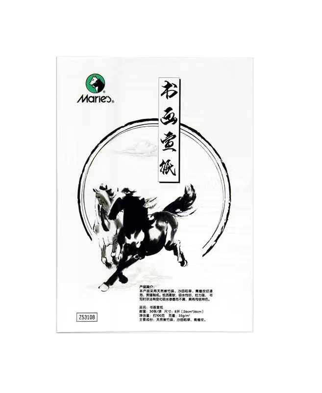 Рисовая бумага — это традиционная основа для китайской живописи и каллиграфии, изготавливается из волокон риса и обладает чрезвычайной тонкостью. Тушь на такой бумаге обладает оптимальной текучестью, необходимой для таких видов техники. Рисовая бумага обладает отличными впитывающими свойствами и не терпит ошибок и исправлений. В блоке 30 листов 36х26 см.