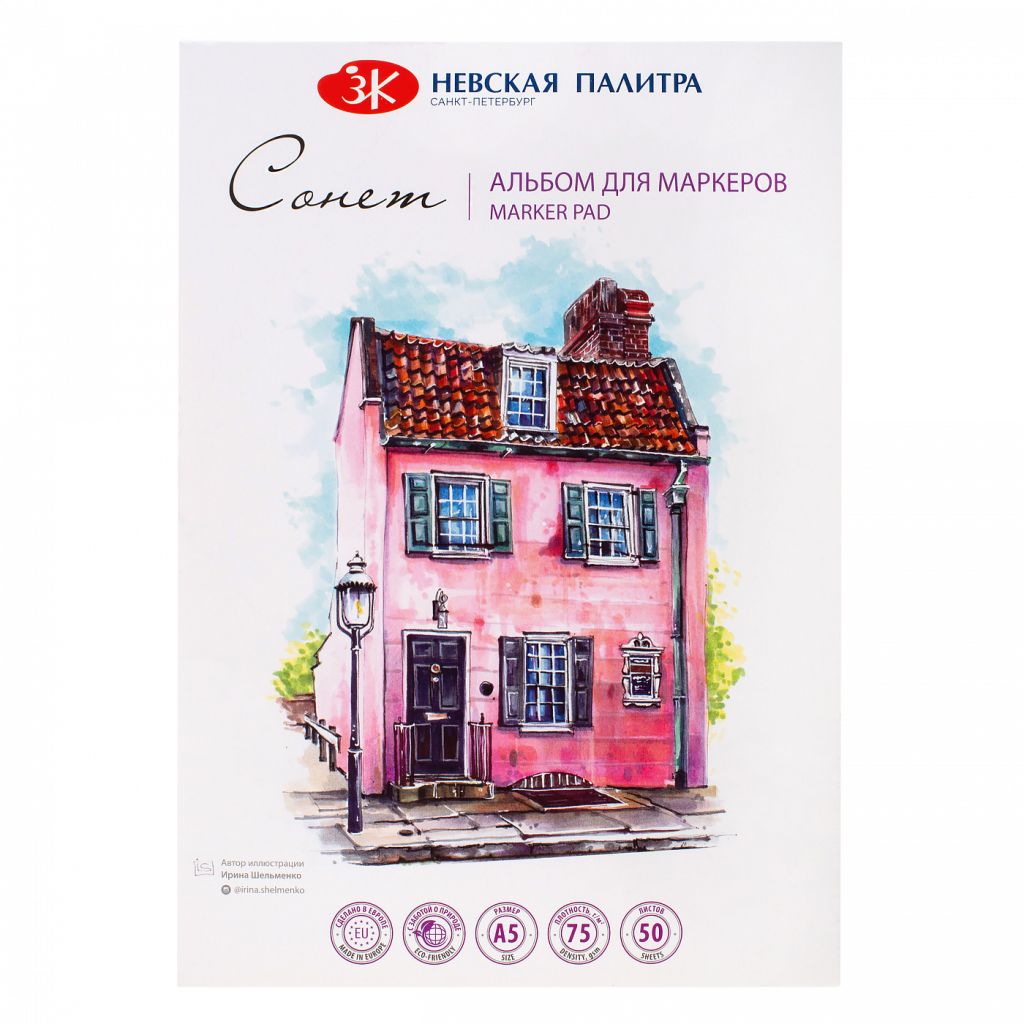 О серии: альбомы для маркеров "Сонет" выполнены из 100% целлюлозы. Листы плотностью 75 гр/м2 обладают белоснежным цветом и гладкой фактурой, благодаря чему обладают отличной цветопередачей. Применение: для художественных работ маркерами и линерами. Производство: производится заводом художественных красок «Невская палитра», расположенным в городе Санкт-Петербург. Завод уже более 80 лет выпускает продукцию для профессиональных художников и любителей творчества.