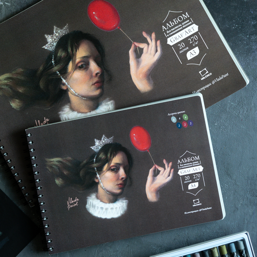 Удобный скетчбук для работы пастелью и сухими графическими материалами «Малевичъ» GrafArt. Внутри скетчбука 20 листов тонированной бумаги разных цветов плотностью 270 гр/м2. Фактура бумаги естественная, не ярко выраженная, позволяет наносить несколько слоев пастели. На бумаге прекрасно работает растушевка, тушевать можно и пальцами, каждый разворот проложен калькой, что обеспечивает сохранность работ на каждой странице. Обложка выполнена из плотного картона, крепление скетчбука на спирали.