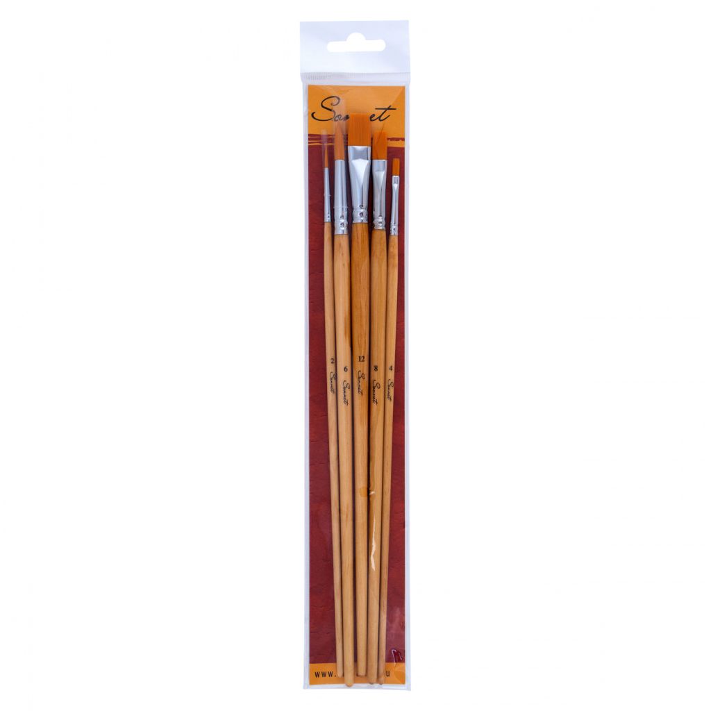 Кисти собраны из конусообразных щетинок, имитирующих натуральный волос средней жёсткости. В наборе представлены плоские кисти для создания чётких ровных линий и больших заливок, а также круглые кисти для прорисовки деталей и фактуры. Применяются для работы маслом, акрилом, гуашью, темперой, лаками. Кисти выпускаются с длинной ручкой, удобной для студийной живописи. Ручка покрыта бесцветным лаком, цельная бесшовная обойма выполнена из нержавеющего металла. В наборе: круглые кисти №2 и №6, плоские кисти №4, 8, 12.