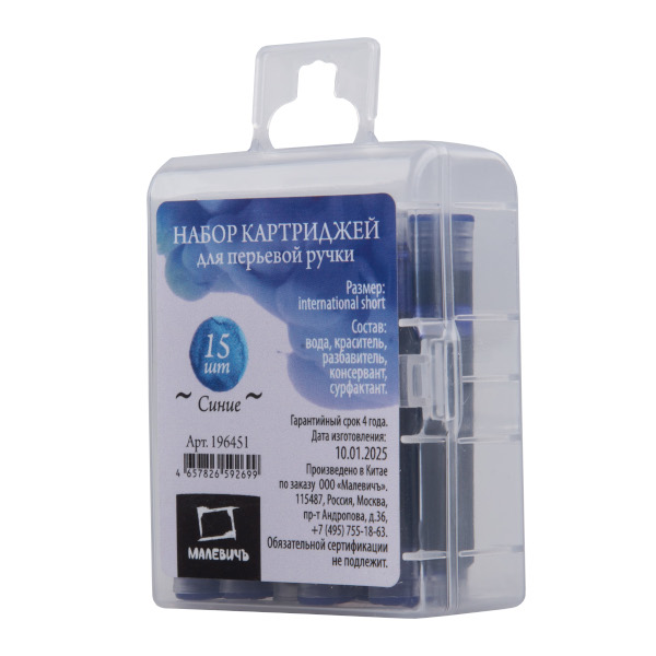 Набор чернильных картриджей для перьевой ручки «Малевичъ» стандарта international short с черными чернилами. Картридж с чернилами экономит время при перезаправки ручки, прост в использовании и позволяет рукам и окружающим предметам оставаться чистыми во время замены. Просто раскрутите ручку, извлеките пустой картридж и поставьте на его места новый до характерного щелчка. Картриджи стандарта international short подходят к большинству типов современных перьевых ручек.