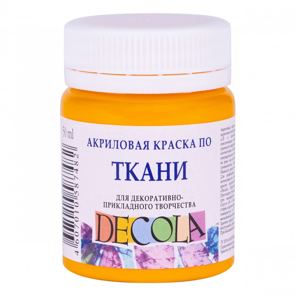 Акрил по ткани «Decola» («Дек?ла») производится заводом художественных красок Невская палитра, расположенным в городе Санкт-Петербурге. Завод уже более 80 лет выпускает продукцию для профессиональных художников и любителей творчества. Акрил по ткани «Декола» предназначен для росписи хлопчатобумажных, шелковых и синтетических тканей. Краска наносится непосредственно на ткань кистью, штемпелем или через трафарет. Готовый рисунок закрепляется горячим утюгом с внутренней стороны. Краска светостойкая, быстро сохнет и не линяет. Для разбавления акрила и получения акварельного эффекта необходимо использовать разбавитель для акриловых красок по ткани «Decola». Акрил по ткани «Декола» представлен широкой палитрой, в которой, помимо основных цветов, есть флуоресцентные, перламутровые и цвета металлики. Все цвета выпускаются в баночках по 50 миллилитров и в различных наборах.