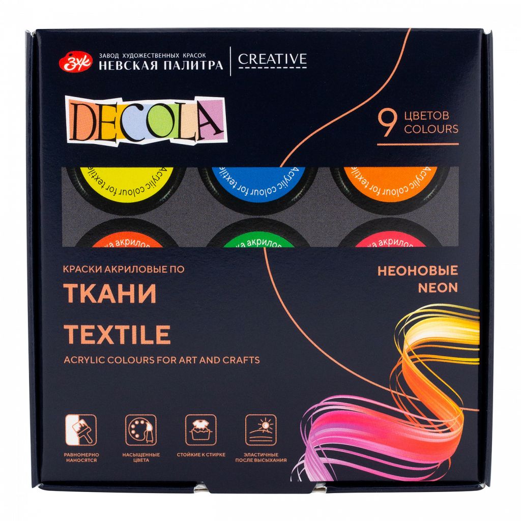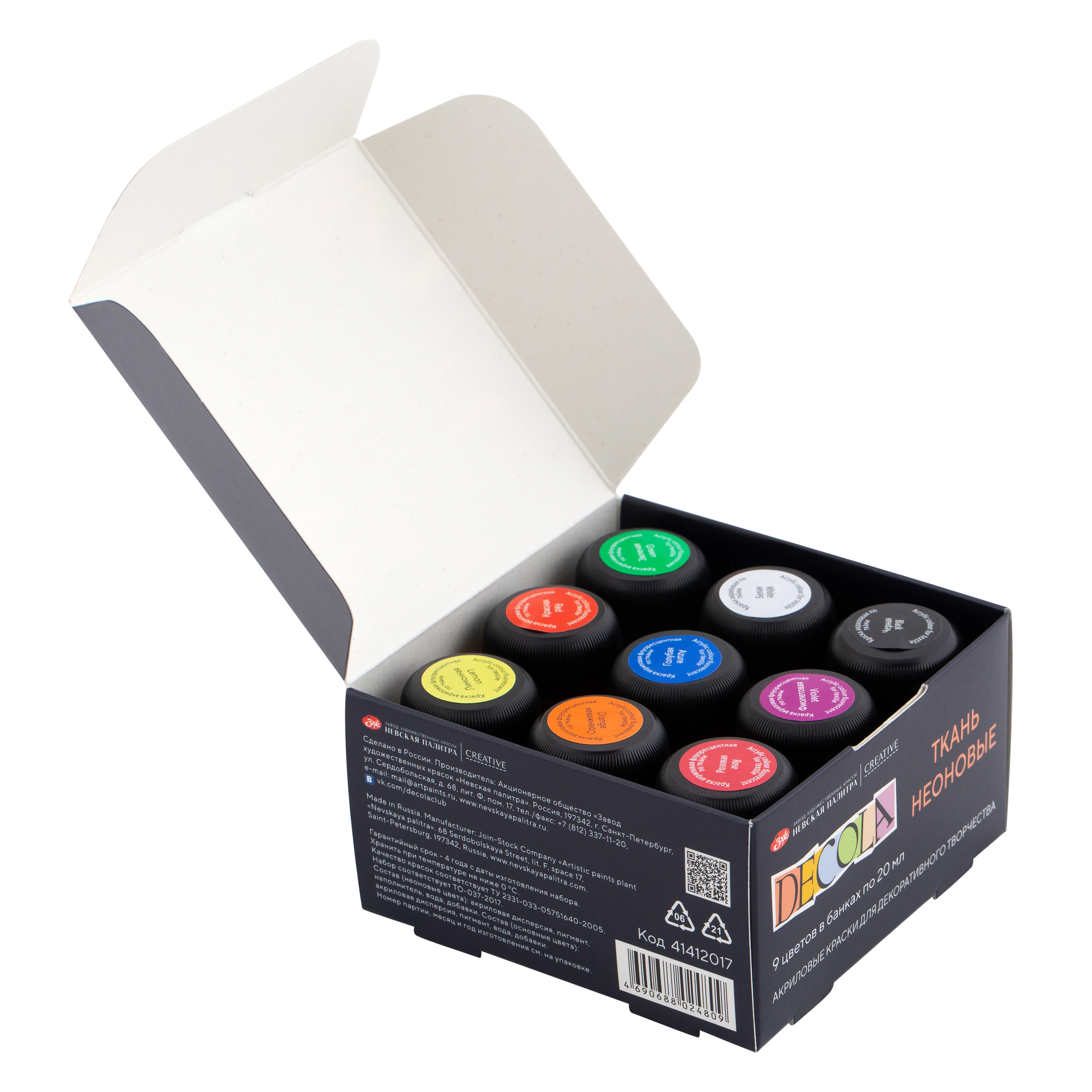 Акриловые краски по ткани серии Decola предназначены для росписи хлопчатобумажных, шелковых и синтетических тканей. Наносятся непосредственно на ткань кистью, штемпелем или по трафарету. Закрепляются горячим утюгом с изнаночной стороны. Краски нее тускнеют со временем, обладают отличной светостойкостью и быстро сохнут. В наборе 9 красок неоновых цветов в баночках по 20 мл.
