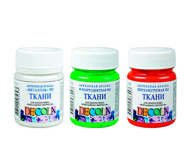Акрил по ткани «Decola» («Дек?ла») производится заводом художественных красок Невская палитра, расположенным в городе Санкт-Петербурге. Завод уже более 80 лет выпускает продукцию для профессиональных художников и любителей творчества. Акрил по ткани «Декола» предназначен для росписи хлопчатобумажных, шелковых и синтетических тканей. Краска наносится непосредственно на ткань кистью, штемпелем или через трафарет. Готовый рисунок закрепляется горячим утюгом с внутренней стороны. Краска светостойкая, быстро сохнет и не линяет. Для разбавления акрила и получения акварельного эффекта необходимо использовать разбавитель для акриловых красок по ткани «Decola». Акрил по ткани «Декола» представлен широкой палитрой, в которой, помимо основных цветов, есть флуоресцентные, перламутровые и цвета металлики. Все цвета выпускаются в баночках по 50 миллилитров и в различных наборах.