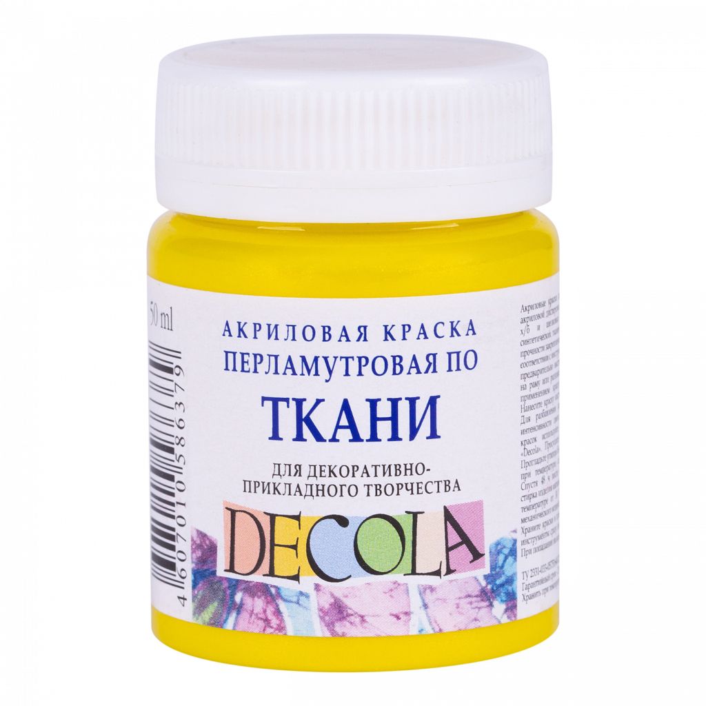 Акрил по ткани «Decola» («Дек?ла») производится заводом художественных красок Невская палитра, расположенным в городе Санкт-Петербурге. Завод уже более 80 лет выпускает продукцию для профессиональных художников и любителей творчества. Акрил по ткани «Декола» предназначен для росписи хлопчатобумажных, шелковых и синтетических тканей. Краска наносится непосредственно на ткань кистью, штемпелем или через трафарет. Готовый рисунок закрепляется горячим утюгом с внутренней стороны. Краска светостойкая, быстро сохнет и не линяет. Для разбавления акрила и получения акварельного эффекта необходимо использовать разбавитель для акриловых красок по ткани «Decola». Акрил по ткани «Декола» представлен широкой палитрой, в которой, помимо основных цветов, есть флуоресцентные, перламутровые и цвета металлики. Все цвета выпускаются в баночках по 50 миллилитров и в различных наборах.