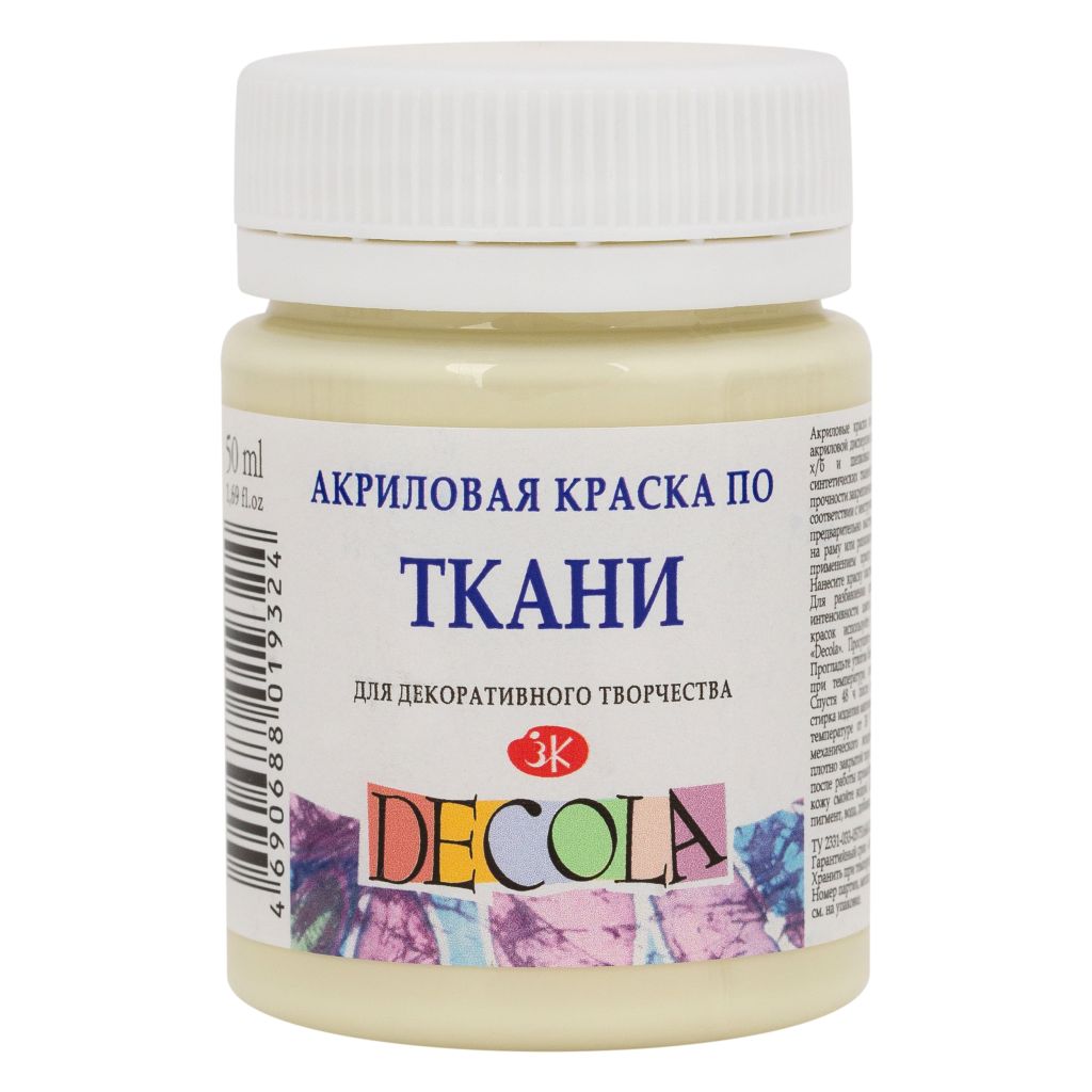Акрил по ткани «Decola» («Дек?ла») производится заводом художественных красок Невская палитра, расположенным в городе Санкт-Петербурге. Завод уже более 80 лет выпускает продукцию для профессиональных художников и любителей творчества. Акрил по ткани «Декола» предназначен для росписи хлопчатобумажных, шелковых и синтетических тканей. Краска наносится непосредственно на ткань кистью, штемпелем или через трафарет. Готовый рисунок закрепляется горячим утюгом с внутренней стороны. Краска светостойкая, быстро сохнет и не линяет. Для разбавления акрила и получения акварельного эффекта необходимо использовать разбавитель для акриловых красок по ткани «Decola». Акрил по ткани «Декола» представлен широкой палитрой, в которой, помимо основных цветов, есть флуоресцентные, перламутровые и цвета металлики. Все цвета выпускаются в баночках по 50 миллилитров и в различных наборах.