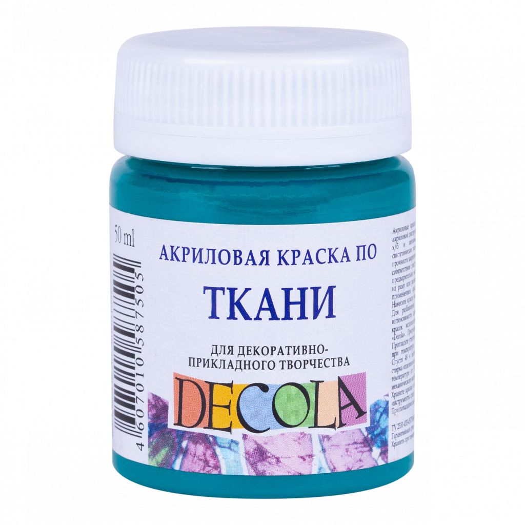 Акрил по ткани «Decola» («Дек?ла») производится заводом художественных красок Невская палитра, расположенным в городе Санкт-Петербурге. Завод уже более 80 лет выпускает продукцию для профессиональных художников и любителей творчества. Акрил по ткани «Декола» предназначен для росписи хлопчатобумажных, шелковых и синтетических тканей. Краска наносится непосредственно на ткань кистью, штемпелем или через трафарет. Готовый рисунок закрепляется горячим утюгом с внутренней стороны. Краска светостойкая, быстро сохнет и не линяет. Для разбавления акрила и получения акварельного эффекта необходимо использовать разбавитель для акриловых красок по ткани «Decola». Акрил по ткани «Декола» представлен широкой палитрой, в которой, помимо основных цветов, есть флуоресцентные, перламутровые и цвета металлики. Все цвета выпускаются в баночках по 50 миллилитров и в различных наборах.