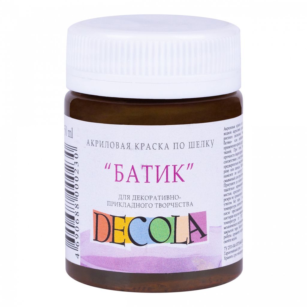 Акриловые краски по шелку "Батик" серии Decola предназначены для различных типов натуральных и синтетических тонких тканей. Наносятся кистью непосредственно на ткань. Обладают хорошей растекаемостью. Краски глубоко проникают в волокна ткани, почти не уплотняя ее. Закрепляются горячим утюгом с изнаночной стороны. Быстро сохнут. Палитра состоит из 18 цветов. Объем: 50 мл.