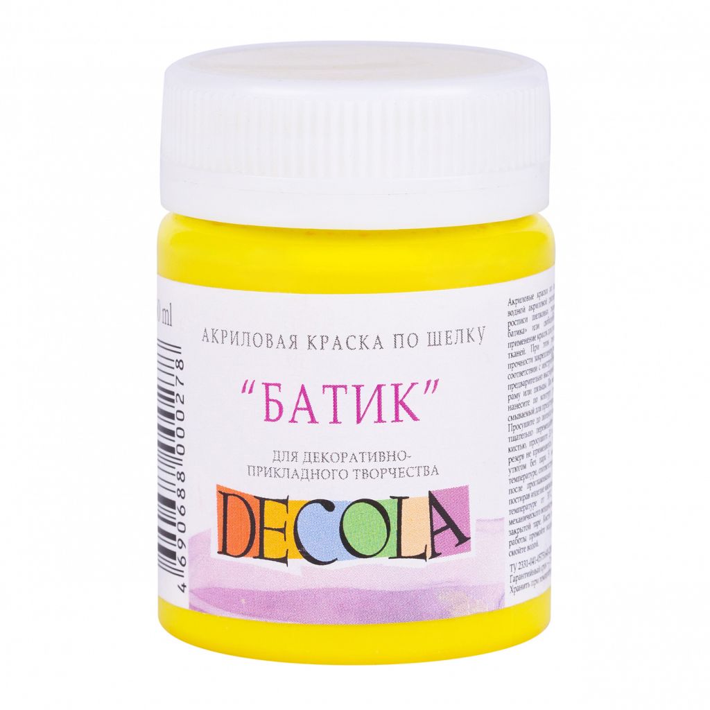 Акриловые краски по шелку "Батик" серии Decola предназначены для различных типов натуральных и синтетических тонких тканей. Наносятся кистью непосредственно на ткань. Обладают хорошей растекаемостью. Краски глубоко проникают в волокна ткани, почти не уплотняя ее. Закрепляются горячим утюгом с изнаночной стороны. Быстро сохнут. Палитра состоит из 18 цветов. Объем: 50 мл.