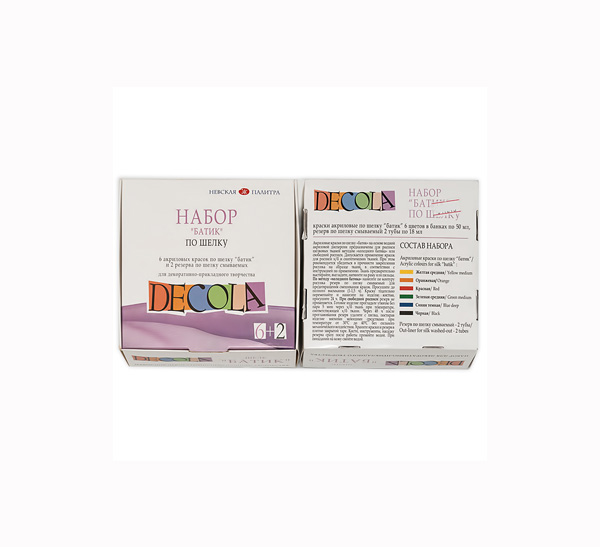 Акриловые краски Decola предназначены для изделий из шелка. Наносятся непосредственно на ткань кистью. Обладают хорошей растекаемостью. Краски глубоко проникают в волокна ткани, почти не уплотняя её. Закрепляются горячим утюгом с изнаночной стороны. Быстро сохнут. В набор входит: 9 цветов.