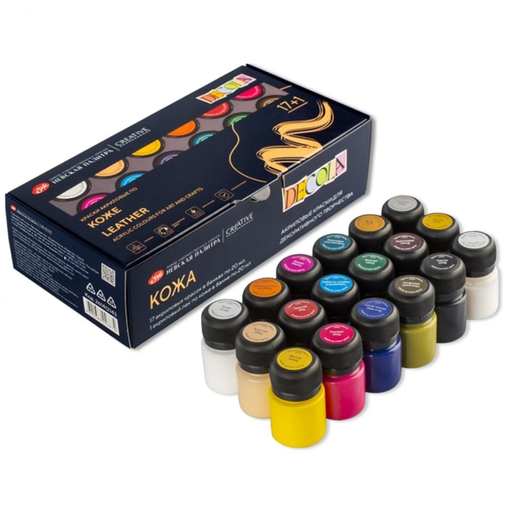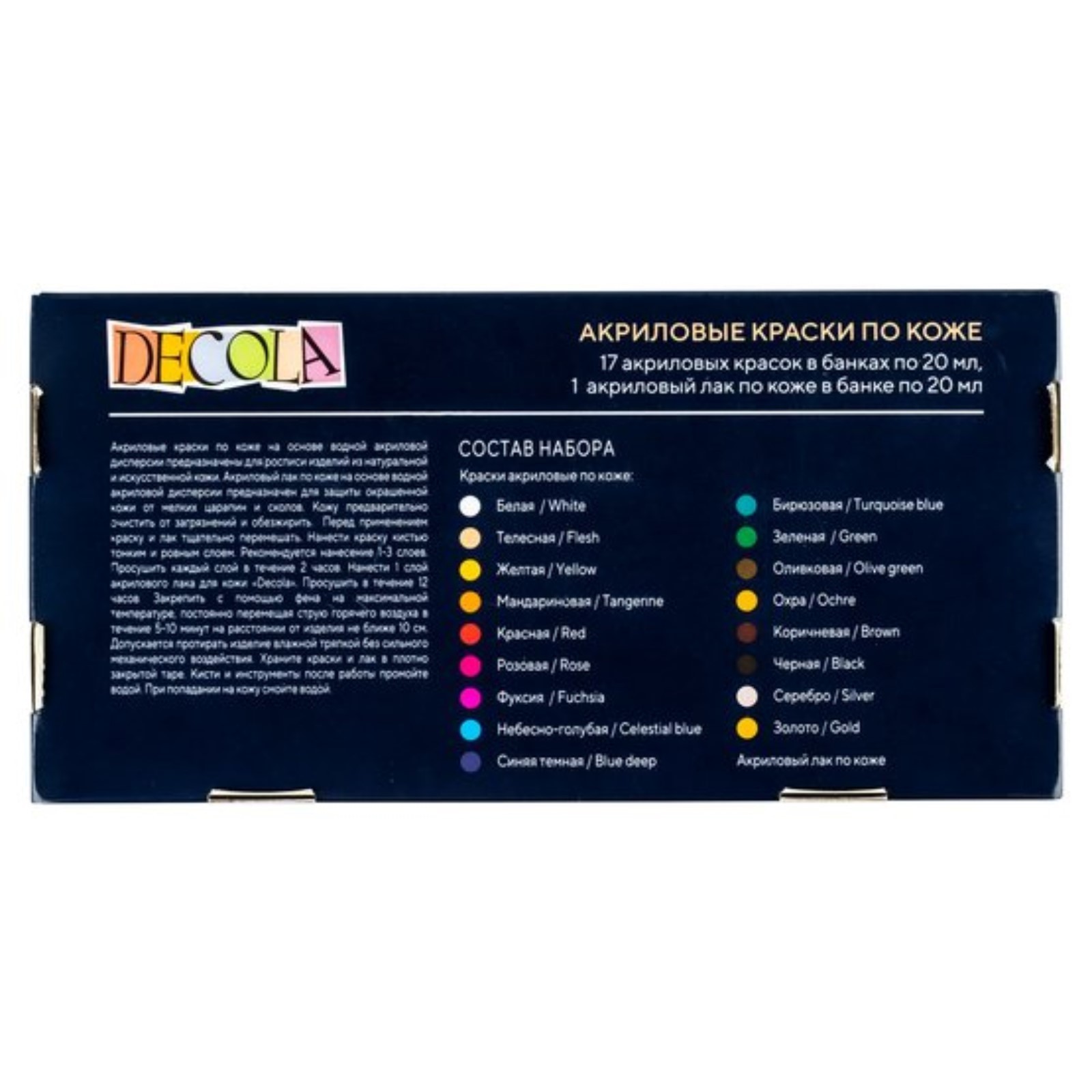 Акриловые краски по коже Decola изготавливаются на основе водной акриловой дисперсии, хорошо смешиваются друг с другом, обеспечивают равномерное покрытие цветом. Не растрескиваются после нанесения, прочно удерживаются даже на гибких и гладких поверхностях. Устойчивы к воздействию воды и высоких температур. Кожу рекомендуется предварительно очистить от загрязнений и обезжирить. Перед применением краску тщательно перемешать. Нанести краску кистью тонким и ровным слоем. Рекомендуется нанесение 1-3 слоев. Просушить каждый слой в течение 2 часов.