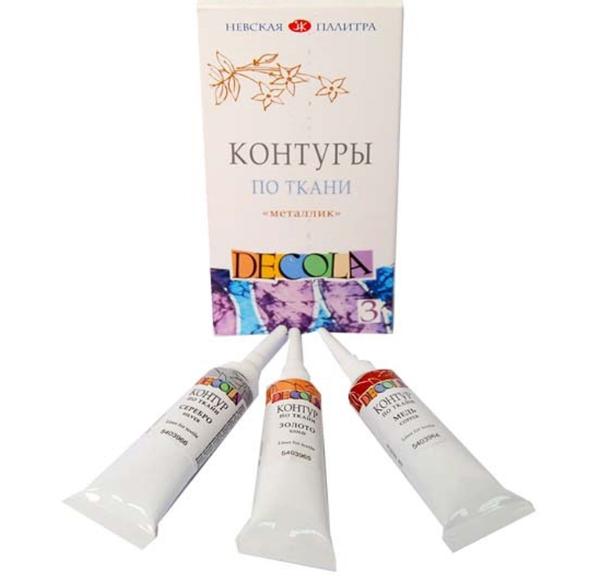 Контуры по ткани Decola на основе акриловых красок серии Decola. Предназначены для росписи хлопчатобумажных, шелковых и синтетических тканей. Контуры обладают хорошей растекаемостью, не тускнеют, светостойкие. Контурами по ткани Decola можно работать в самых разнообразных техниках – трафаретной, свободной росписи, холодного батика. Закрепляются горячим утюгом с изнаночной стороны. В данном наборе представлено три цвета: золото, серебро и медь.