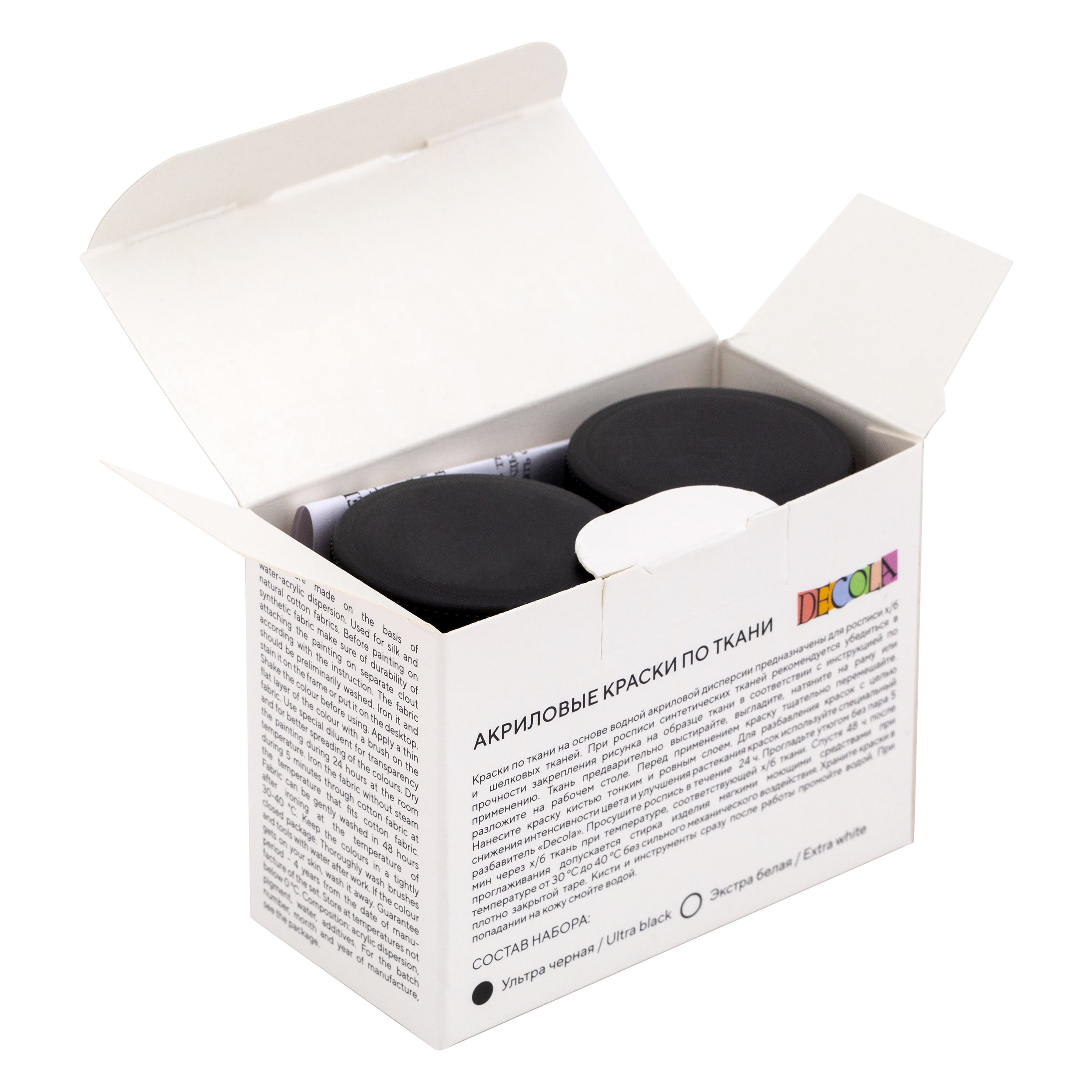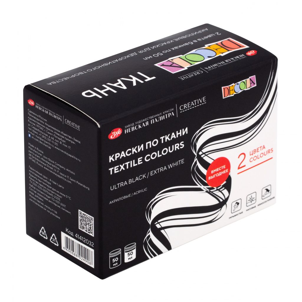 Акрил по ткани «Декола» предназначен для росписи хлопчатобумажных, шелковых и синтетических тканей. Краска наносится непосредственно на ткань кистью, штемпелем или через трафарет. Готовый рисунок закрепляется горячим утюгом с внутренней стороны. Краска светостойкая, быстро сохнет и не линяет. Для разбавления акрила и получения акварельного эффекта необходимо использовать разбавитель для акриловых красок по ткани «Декола». В наборе 2 цвета: экстра белый и экстра чёрный.