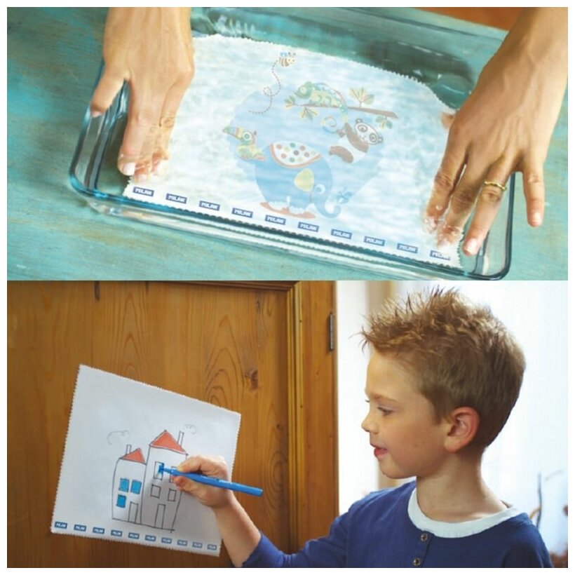 Набор для детского творчества включает в себя панель для рисования с возможностью смывания и нанесения новых рисунков, 5 смываемых фломастеров и 5 трафаретов. Такой набор отлично подойдет для развития творческих навыков у ребенка. Для удаления рисунка просто замочите панель в теплой воде на 5 минут и смойте нарисованное, после высыхания можно рисовать снова.