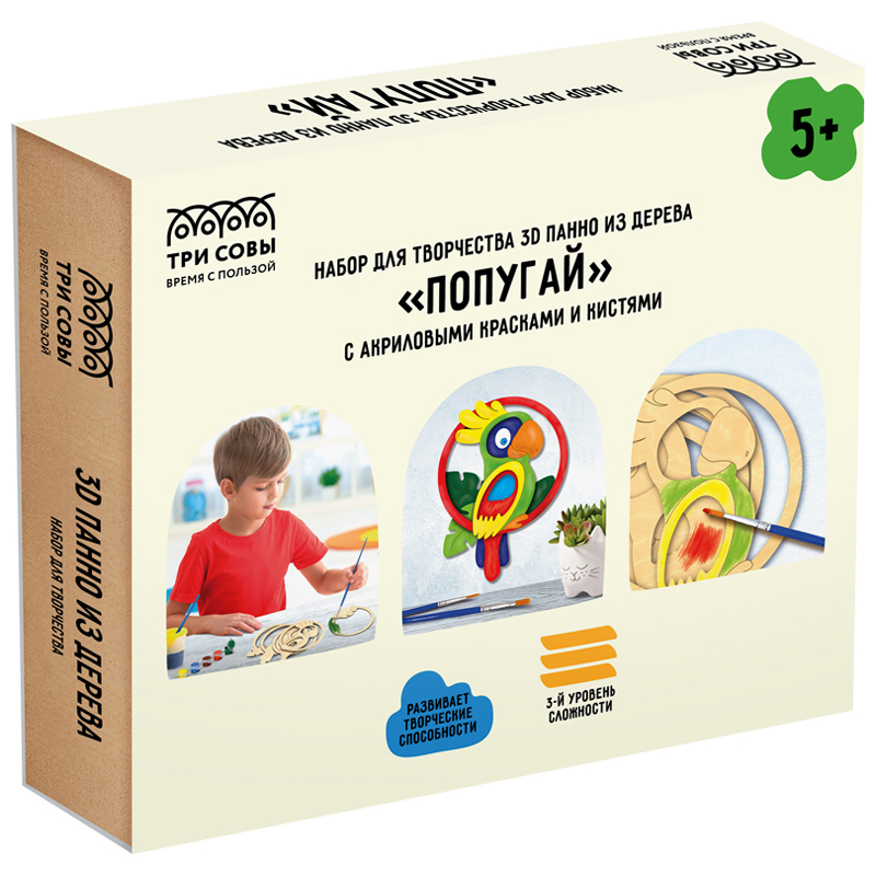 Набор для творчества «ТРИ СОВЫ» для создания 3D-панно из дерева станет отличным подарком. Он поможет развить образное мышление, логику, моторику и творческий потенциал ребенка. Набор подойдёт для начинающих юных художников и совместного времяпрепровождения детей и их родителей. В комплект входит: 1. 5-слойная фанера с нанесённым контуром для раскрашивания; 2. акриловые краски 6 цветов по 3 мл; 3. кисть средняя круглая и плоская; 4. крепление на стену 1 шт.; Клей не входит в комплект. Можно использовать любой, подходящий для дерева (в том числе ПВА). В процессе работы каждая деталь раскрашивается отдельно, просушивается, затем они склеиваются в красивое 3D-панно. Готовую работу можно повесить на стену или поставить на подставку на стол. Набор упакован в коробку из крафтового картона с красочной информационной лентой.