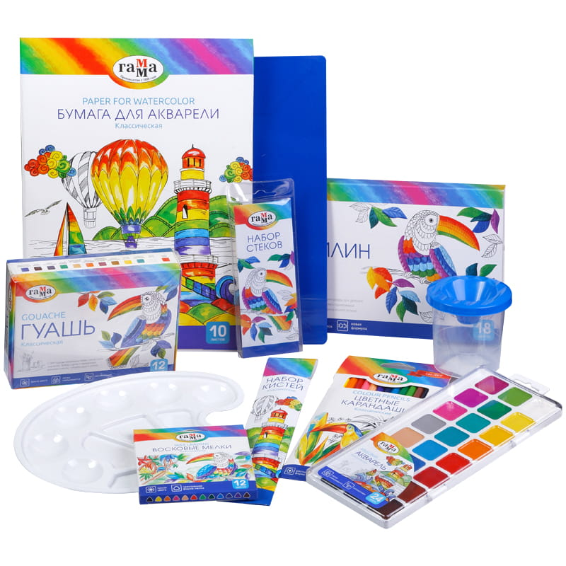 Набор для творчества в яркой коробке — прекрасный подарок для юного художника. В набор вошли лучшие продукты ГАММА серии «Классическая», а также вспомогательные материалы: кисти, стеки, стаканчик-непроливайка, палитра, бумага для рисования. Состав набора: - акварель «Классическая» 24 цвета - гуашь «Классическая» 12 цветов, 20 мл - пластилин «Классический» 18 цветов - цветные карандаши «Классические» 12 цветов - восковые мелки «Классические» 12 цветов - набор кистей: пони круглая №2, №5, №8 синтетика плоская №3, №5 - набор акварельной бумаги, 10 листов - стакан-непроливайка - палитра художника овальная - доска для лепки A4 - набор стеков «Классический» 4 шт.
