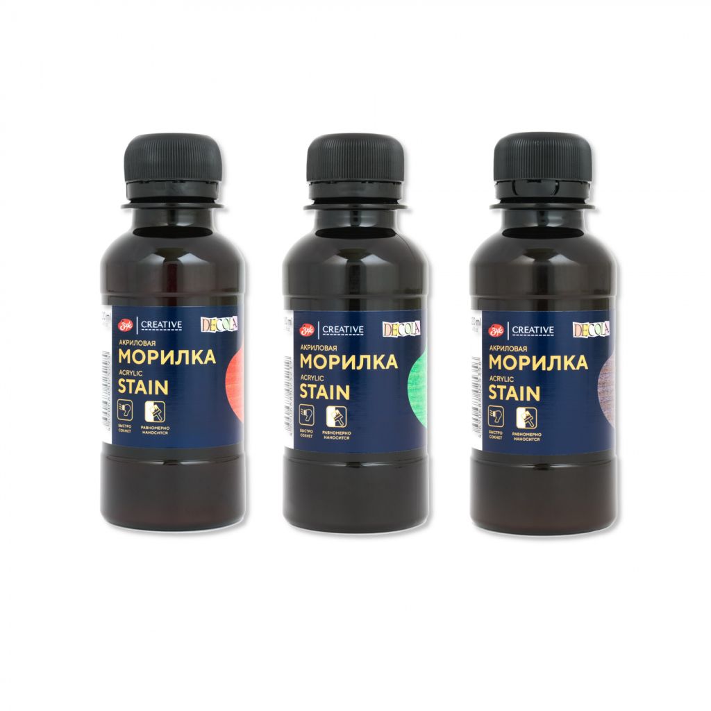 Акриловые морилки предназначены для тонировки древесины в декоративном творчестве. Акриловые морилки представляет собой тонкодисперсную суспензию органических и неорганических пигментов в водной акриловой дисперсии с добавлением консерванта. Наносятся на зашкуренную и обеспыленную поверхность валиком, тампоном, спонжем, кистью или распылителем в один или несколько слоев до достижения требуемой интенсивности цвета. Хранить при температуре не ниже 5 градусов. Состав: акриловая дисперсия, вода, пигмент, добавки, биоцид (содержит консерват (2-Феноксиэтанол, 1,2-Пропанэдиол, 3-(2-этил-гексилокси). Может вызвать аллергические реакции.