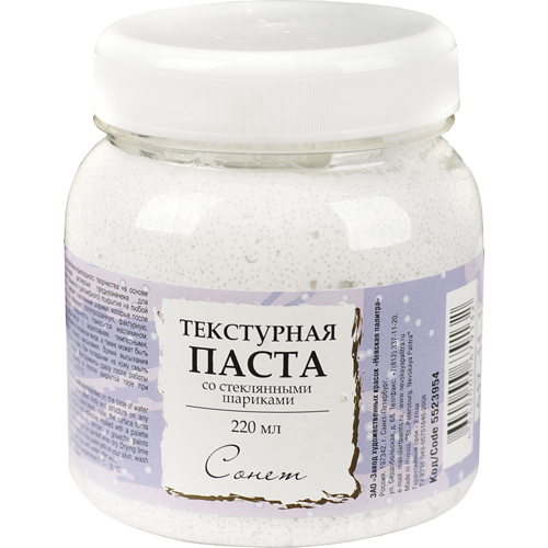 Паста для декоративно-прикладного творчества на основе водной акриловой дисперсии предназначена для формирования объемного (рельефного) покрытия на любой поверхности. Наносится кистью или мастихином. После высыхания образует прочный эластичный несмываемый водой рельеф. Высохшую поверхность можно окрашивать акриловыми, темперными, гуашевыми, масляными красками. При попадании на кожу смыть теплой водой с мылом. Кисти и инструменты сразу после работы промыть водой. Хранить в плотно закрытой таре при температуре от 5?С до 35?С.