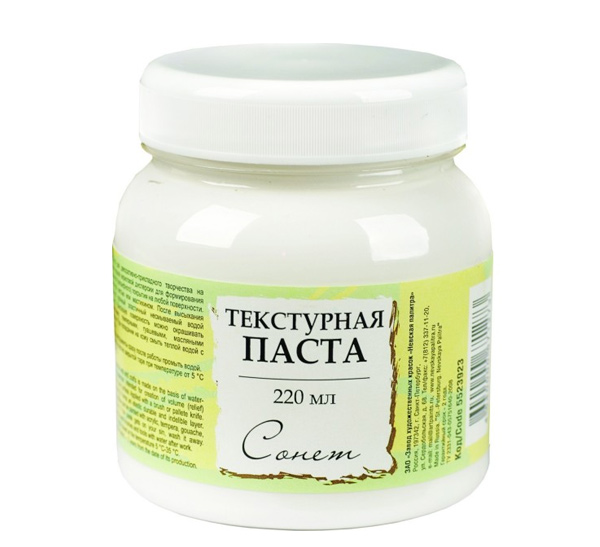 Паста для декоративно-прикладного творчества на основе водной акриловой дисперсии предназначена для формирования объемного (рельефного) покрытия на любой поверхности. Наносится кистью или мастихином. После высыхания образует прочный эластичный несмываемый водой рельеф. Высохшую поверхность можно окрашивать акриловыми, темперными, гуашевыми, масляными красками. При попадании на кожу смыть теплой водой с мылом. Кисти и инструменты сразу после работы промыть водой. Хранить в плотно закрытой таре при температуре от 5?С до 35?С.