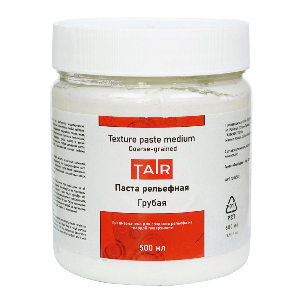 Паста акриловая рельефная грубая Таир. Применяется для фактурного моделирования поверхностей. Паста отлично смешивается со всеми водорастворимыми красками, акварелью, гуашью, акрилом и всеми акриловыми материалами, выпускаемыми «ТАИР». Высохшая грубая рельефная паста имеет шероховатую пористую поверхность. Объем: 500 мл.