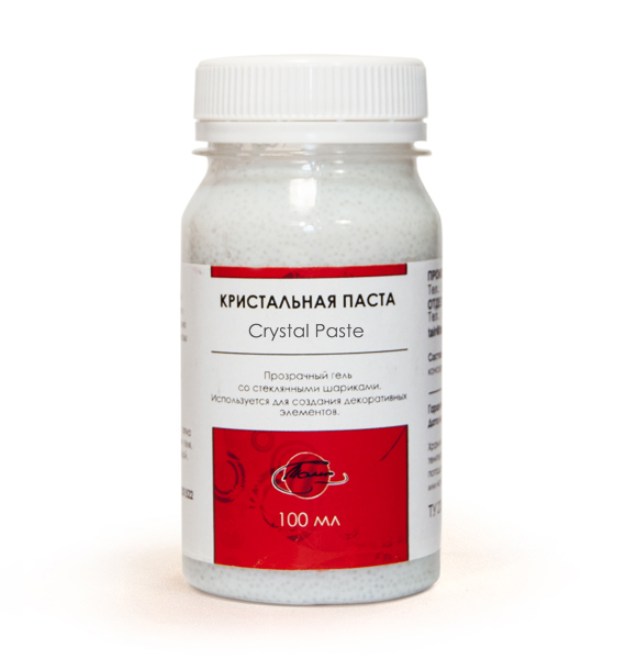 Паста кристальная Таир. Представляет собой прозрачный моделирующий гель, наполненный мелкими стеклянными шариками. Служит для имитации ледяного налета, создания рельефной поверхности. Благодаря множеству стеклянных шариков кристальная паста красиво преломляет свет, поэтому наиболее выгодно она смотрится при декорировании стекла, ламп, подсвечников. Легко выдерживает нагрев. Время до полного высыхания — 24 часа. Объем: 100 мл.