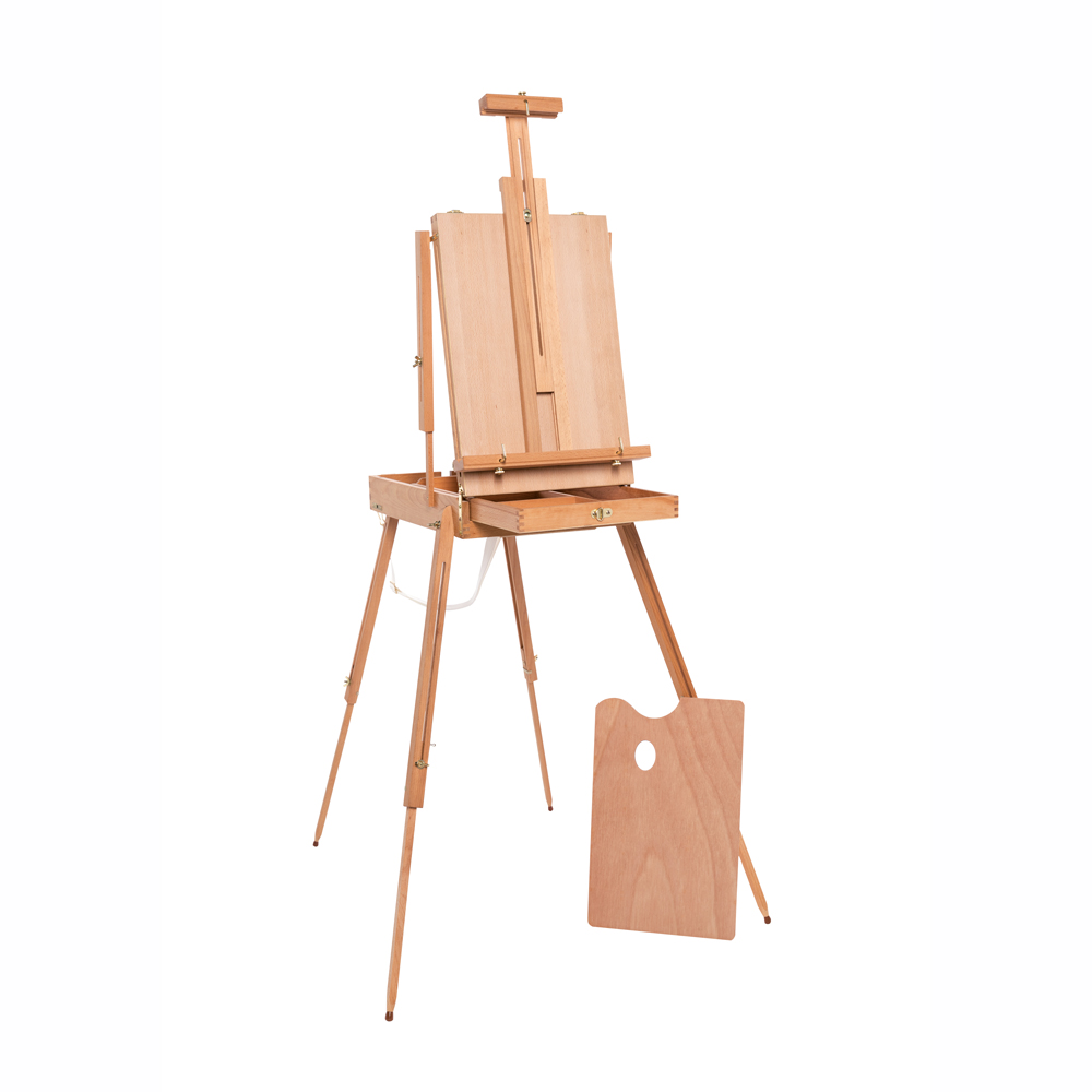 Этюдный ящик с улучшенной конструкцией, оснащен 4 ножками для лучшей устойчивости. Может использоваться как для работы в помещении, так и на улице. Ножки этюдника регулируются по высоте, что позволяет подстроить этюдник под свой рост, а также работать как сидя, так и стоя. Полка для холста также регулируется. Холст можно наклонить как на себя, так и от себя, в зависимости от потребностей художника. В ящик этюдника вы можете положить кисти, краски и другие принадлежности. В сложенном виде его можно использовать как настольный мольберт. В комплект входит палитра и ремешок для ношения на плече. Выполнен из бука. Характеристики: Материал: бук Высота: от 142-180 см. Ширина: 44 см. Максимальная высота холста: 85 см. Вес: 6 кг.